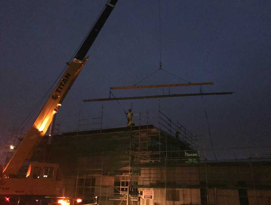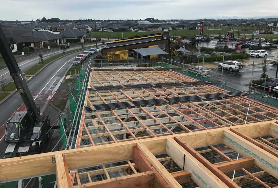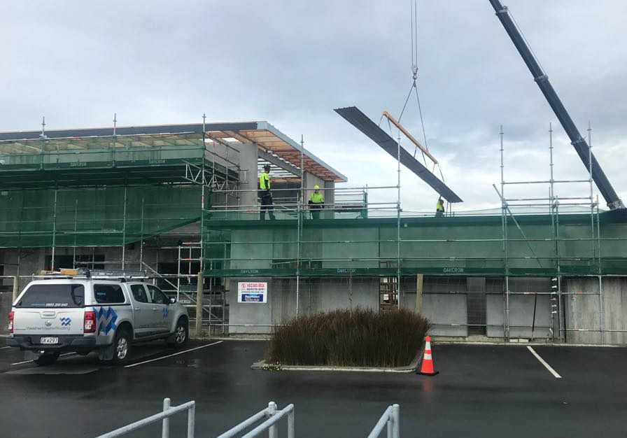 The roofing has begin with early morning crane lifts placing the long .55 Colorcote Veedek roof sheets, ready for our tradesmen to install the roof to our usual high standards. The raked head roof design provides an impressive, modern element to the newest building at The Landing, Wigram.